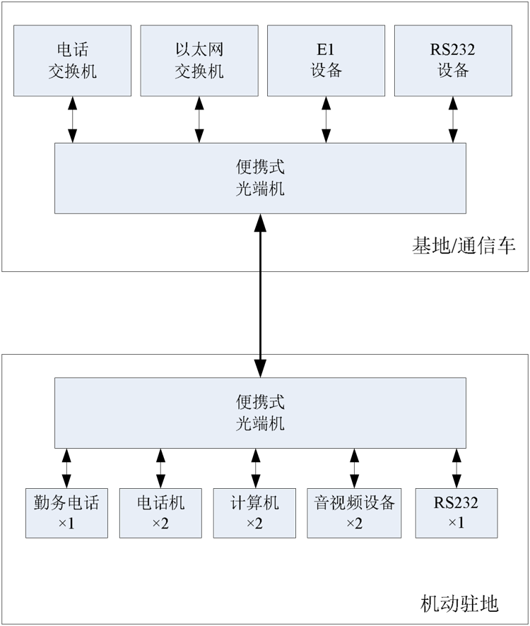 该方案采用155M的光传输技术,提供电话、以太网、E1、RS232串口等多种通信业务,可为机动驻地与基地之间、前端小分队与通信车之间提供高速多业务的通信解决方案。